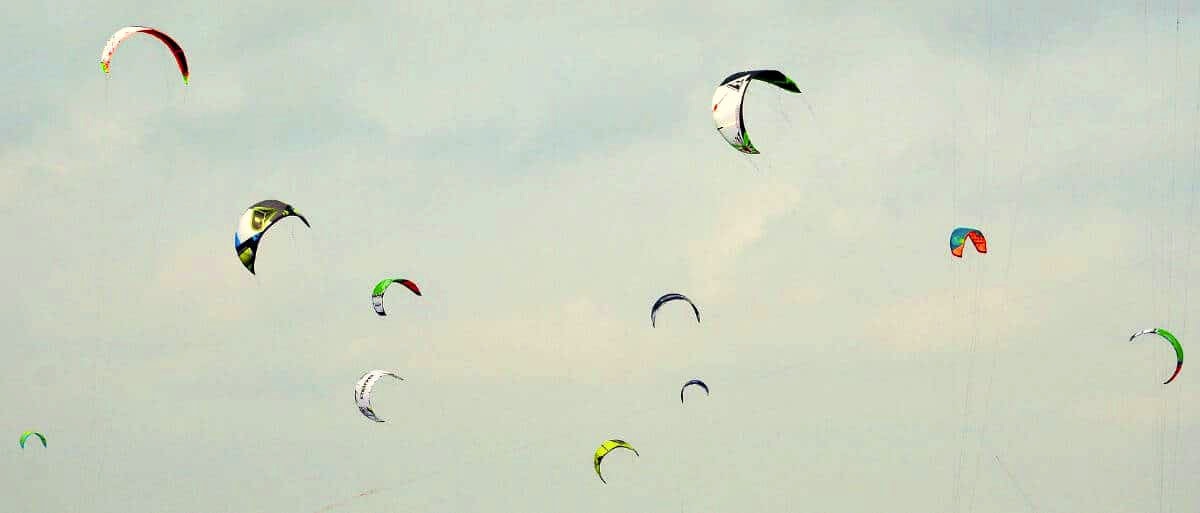Neuer Versuch. Starten, hochgucken, gegenlenken, an die Bar klammern. Platsch. Am Anfang, wenn man ohne Board im Wasser stehend übt den Drachen zu bändigen, wird man zu Stabilisierungszwecken festgehalten. Dafür ist hinten der Griff am Trapez. Lässt man die Bar im richtigen Moment los, klappt das auch. Das leuchtete mir in der Theorie vollkommen ein und bei den anderen funktionierte es auch ganz praktisch. Sie blieben nicht nur stehen, sogar die Matte blieb in der Luft. Wir wechselten ein paarmal durch und holten dann den zweiten Kite dazu. Die Mittzwanzigerin hantierte mit der Lenkstange als wäre sie mit der Harley zum Kitekurs gekommen. Sie schien fast gar nichts zu tun und ihr Drache tanzte wendig im Wind. Zu meiner Ehrenrettung sei gesagt, dass sie Windsurferin und Profitänzerin ist und ich aus Dortmund komme.