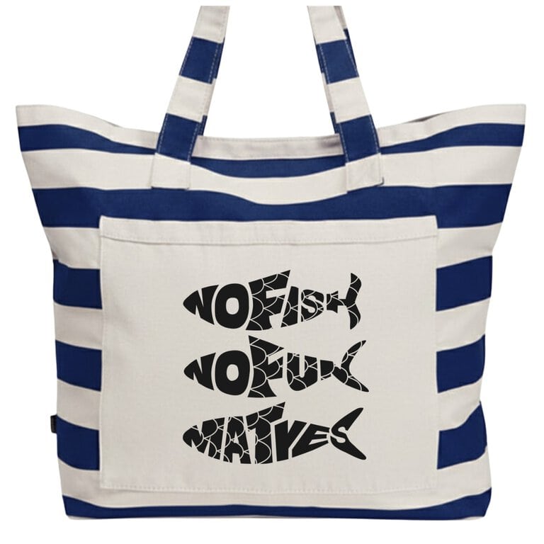 Große Strandtasche mit 2meere-Print mit Fischen „NoFish NoFun MatYes“